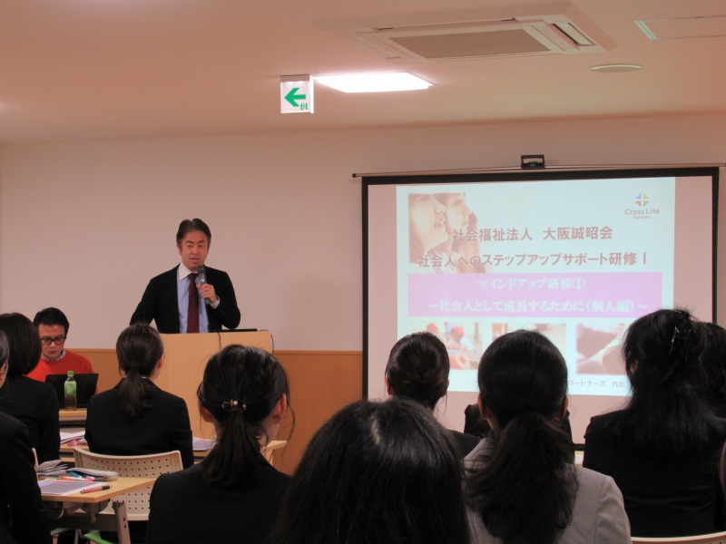 今回の研修では.当法人理事長の田中啓昭と幼稚園のトータルサポート事業や地域密着型コミュニティ創造事業をされており、当法人も日頃より大変お世話になっている株式会社クロスライフパートナーズ代表取締役の雑賀竜一先生をお招きして、社会人として成長するための基礎知識や仕事に対する心構え等について研修を行いました。