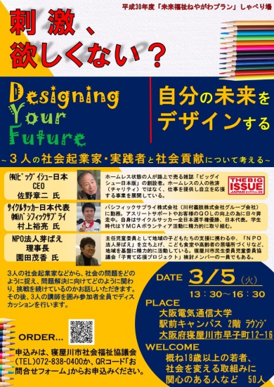 私は「未来福祉ねやがわプラン」の未来福祉デザイン会議の常任委員を委嘱されていますが、その未来福祉デザイン会議からの発案で、3名の社会起業家から社会の問題を考え、問題解決に向けてどのように挑戦しているのかという話の後に、参加者とディスカッションの場をもつ取り組み、未来福祉ねやがわプラン「しゃべり場」が開催されます。