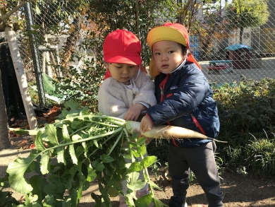 今回は姉妹園のねやがわ寝屋の森こども園とねやがわ成美の森こども園の園庭にある自然農園「KIDS FARM」で美味しそうに育った大根をたくさん収穫し、法人の代表として成美の森こども園の子ども達がゴマジェットカフェに大根を届け、お弁当に入れていただきました。