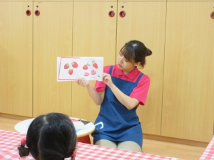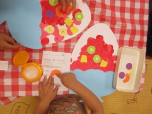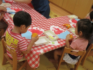 導入で「くだものあーん」という果物がたくさんでてくる絵本を読み、果物に興味も持てるようにし、のりの使い方を復習した後、一つずつ丁寧に貼っていました。