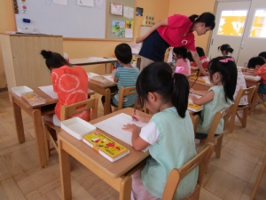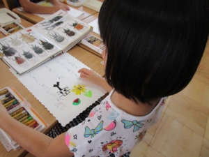今回の教育・保育では、季節ならではの風習に興味を持ち、文字の書く面白さを感じながら取り組む姿が見られました。文字を書くときには、書き順、鉛筆の持ち方を意識しながら取り組んだり、また夏をイメージするものはどのような物があるかグループで話し合いをし、残暑見舞いに描く、ひまわりやかぶとむしなどを図鑑で調べながら楽しんで取り組む姿が見られました。