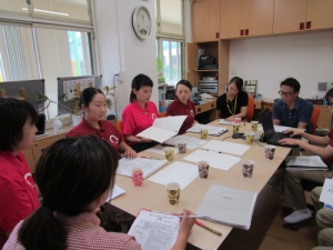 公開保育終了後は、見学したスタッフでポイントや疑問点・課題などを話し合いを行い、その中で法人としての文字活動における年間の目標・ねらいを統一することで園や担任による差が出ることがなく、活動に取り組んでいくことができるように今後内容を具体的に検討していくこととなりました。子どもの人数やクラス編成に違いはありますが、法人として教育・保育を進める上での方向性を考える貴重な時間でした。