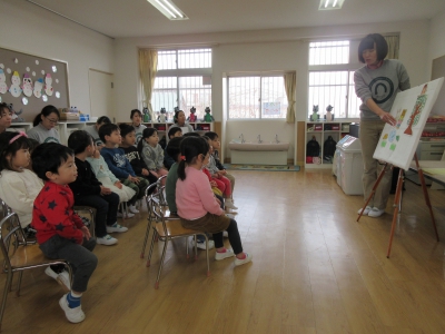 ・お話を通して、よいことや悪いことがあることに気付き、生活の中できまりを守ろうとする。ということをねらいに保育を行いました。