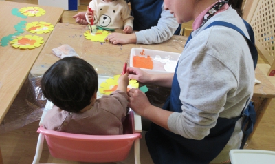 今回の保育では、色に注目し「あか」「あお」と言いながら楽しみ、保育教諭と一緒に絵の具(タンポ)や布積み木で表現していました。