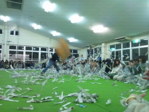 ダイナミックな新聞遊び。新聞が舞い上がることで、目に見えない「風」を感じることが出来ました。子ども達が大喜びしそうです!
