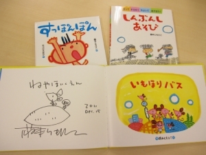 研修後に、おおわだ保育園の園長先生より藤本さんの絵本と、保育に活用できる「しんぶんしあそび」の本をいただきました。藤本さんのサインまでいただいて、お二人のお気持ちに感謝いたします。