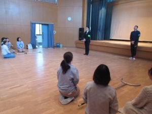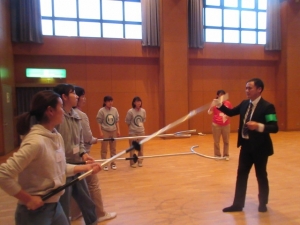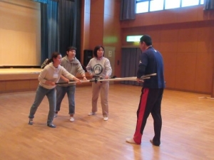 さすまたを使った研修ではグループに分かれ、実際の状況を想定して不審者対応の方法をご指導して頂きました。