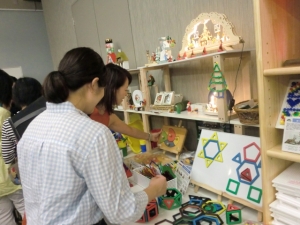 研修会場には、乳幼児期の子どもにおすすめのたくさんのおもちゃやカードゲーム、絵本などの販売もあり、実際に遊んでみて子ども達が楽しめそうな玩具を購入することができました。