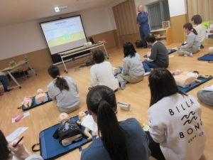 グループごとでの実践では、応援を呼んだり交代に心肺蘇生を行ったりと臨機応変な対応が求められ、とにかく「落ち着く」ということが大切だと身をもって感じる機会になったと思います。