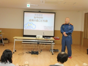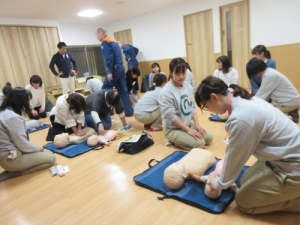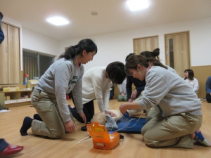 寝屋川・枚方消防署から3名の消防士の方にお越しいただき、心肺停止状態になった時に行う「心肺蘇生法」と「AED(自動体外式除細動器)」の使い方を教えて頂きました。