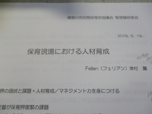 令和元年6月19日に寝屋川市民間保育所協議会主催の「管理職研修会」に園長と共に参加し、「保育現場における人材育成」について学んできました。
