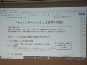 令和元年9月19日(木)に、寝屋川市民間保育所協議会主催の「保育士研修会」に当園園長と共に参加し、大阪保育総合大学の瀧川光治教授より「ドキュメンテーションを活用した保育の可視化について」学んでまいりました。