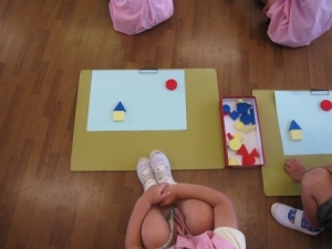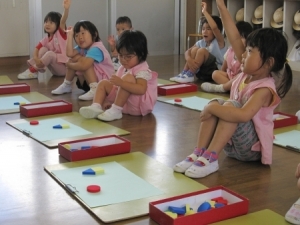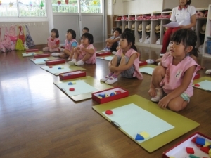 みんな、図形あそびの教材の色・形・大きさに注意し、見本と対応して同じものを作る事に楽しんで取り組めました。