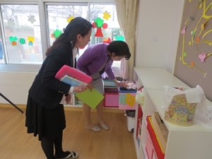 研修前には、瀧先生が各保育室を回り、年齢に応じたおもちゃの使い方や展開の仕方を丁寧にご指導頂きました。