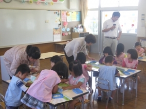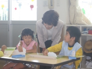 教材に興味を持って子ども達が喜んで遊んでいた様子を見て、日頃から楽しい保育を心がけておられることを感じました。また、子ども達はみんな、自分達の思いをいっぱい話してくれ、言葉のキャッチボールができる素直なお友達でした!!と、小林先生からお言葉をいただきました。
