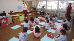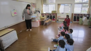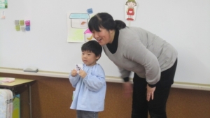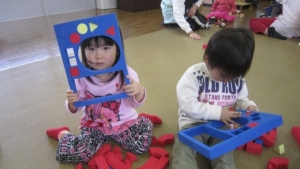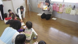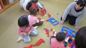 先日、社団法人 日本幼年教育会 研究部講師の小林まきこ先生と山本部長をお迎えしまして、0歳からの新教材開発の研究保育をりす組(1歳児)うさぎ組(2歳児)で取り組みました。