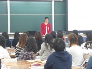 講演では、幼稚園との違いや保育園での生活につて、また保育士になったきっかけなど保育士として働く中で体験・経験したことをお話したうえ、「働くということ、保育の仕事の楽しさ、社会人になる心構え」を学生の皆さんに伝えていました。