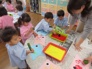 5月1日 うさぎ組(2歳児)にて野菜スタンプを使ってこいのぼりに模様づけをしました。