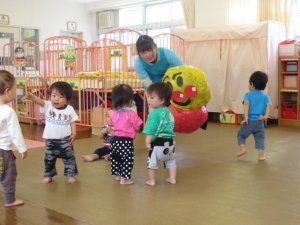 5月22日(水)りす組にて、破った新聞紙をポリ袋に入れ、1つの大きなアンパンマンを作りました。