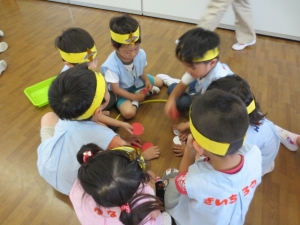 5歳児が4歳児を引っ張ってくれて、グループ内で協力している姿も見られました。
