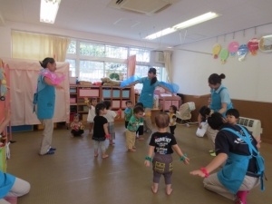 保育内容は、まず手作りの手袋を使って、「キャベツの中から」の手遊びをし、絵本を見ることでより興味を持ち、保育士がちょうちょうに変身し、子どもたちと一緒に音楽に合わせながら、お散歩に行きます。お散歩の途中には、お花畑やあおむしと出会い楽しみ、最後はちょうちょうのママが迎えに来て、音楽に合わせて運動会で踊る「ちょうちょのサンバ」を踊って楽しむという内容でした。