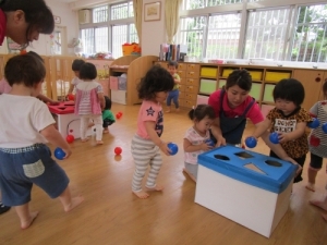 1歳児のお友達は、お部屋に転がった卵(ボール)を同じ色のお家に帰してあげる遊びをしました。