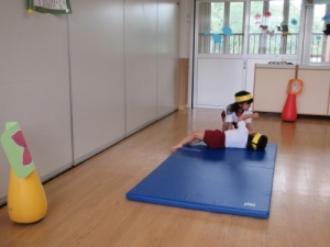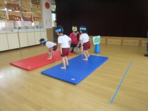 その後には、『グーパージャンプの術』 『変身の術(カエルに変身)』など様々な跳躍運動を楽しみ、最後には子ども達の大好きなマット運動なども取り入れたサーキット運動を楽しみました。マットで転がったり両足で跳んだり片足ずつ跳んだりしながら、全身を使って目標に向かって意欲的に取り組むことができていました。また、友達が頑張っている時には「がんばれー!」と応援する姿も見られました。