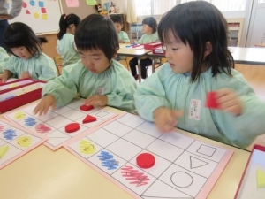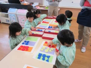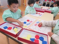 2017年10月31日(木)にきりん組(3歳児)で教材スタートあそびを使用し、色かたちあそびを行いました。
