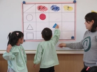 保育内容は、スタートあそびのかたちブロックを使って色や形を関連付けながら仲間分けをして遊びました。その後にはマトリックスの図を使い、自分でヒントを見て読み解きながら表を埋めて楽しみました。