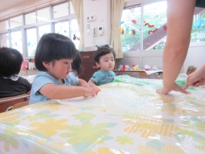 また、制作で使う様々な種類のタンポを紹介し、段ボールやタオル、プチプチを実際に触り、素材の特徴や違いに気付けるよう、「ザラザラ」「ツルツル」「ボコボコ」等、言葉掛けをしました。