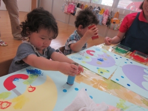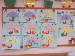 制作では、スタンプで画用紙にトントンと色を付けて楽しんでいました。それぞれ、素敵な傘の中にかえるやかたつむりを入れてあげ、完成です。