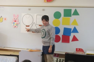仲間分けでは、丸、三角、四角の仲間分けを行いました。子ども達は一生懸命考えながらも、形をよく見て仲間分けをすることが出来ていました。自分のシートを使った活動も初めてでしたが、自分のスペースで操作をするということも楽しむことが出来ました。