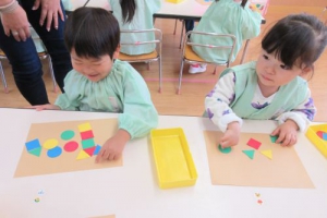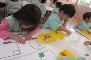 子ども達が図形に興味を持つことができるよう、普段から図形パズルなどに取り組んできました。図形を意識する遊びに取り組む中で、子ども達はイメージする力がつき、図形の概念を習得していきます。