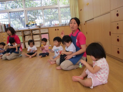 まずは、「手をたたきましょう」の手遊びから音を楽しみました。