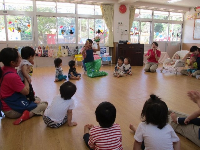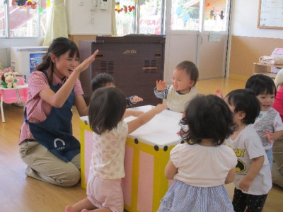 みんなで「きらきら星」を歌ってマラカス遊びを楽しんだ後は、段ボールでできた大きな太鼓で楽器遊びです。