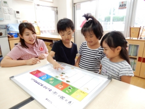 当園でも森先生からのアドバイスも受けながら、給食に”ま・ご・わ・や・さ・し・い(ま…豆類/ご…ごま/わ…わかめ・海藻類/や…野菜/さ…魚/し…しいたけ・きのこ類/い…いも類)”を意識した献立のものを定期的に提供したり、給食に使われている食材を”ま・ご・わ・や・さ・し・い”に分類するのを子ども達自身がお当番活動として行ったりしていて、日本の伝統食文化である”和食”を大切に捉え、身近に自然に取り入れられるようにしています。