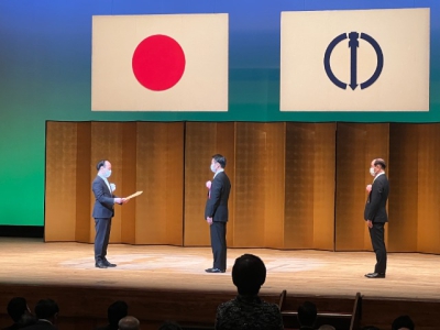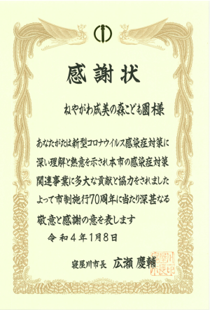 2022年01月14日(金) 市制施行70周年記念式典で表彰されました! カテゴリー:こども園からのお知らせ 令和4年1月8日に寝屋川市民会館 大ホールで開催された「市制施行70周年記念式典」にて新型コロナウイルス感染症対策関連事業に協力した団体として、ねやがわ寝屋の森こども園・ねやがわ成美の森こども園が特別表彰されました。表彰されたその協力団体の代表として当法人の理事長 田中啓昭が登壇し、寝屋川市長より直接、感謝状を拝受しました。 これからも寝屋川市の子どもたちのために、ひいては寝屋川市の発展のために、市政に協力をしていきたいと思います。