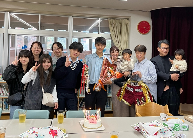 前回も一緒に訪れてくれた平成25年度卒園組の4人と、2児の母になった元スタッフもお祝いに駆け付け、みんなでまーちゃんのデビュー&勝利のお祝いをすることができました。その後はそれぞれの近況報告や思い出話に花が咲き、笑い声が絶えず、幸せでうれしいひとときとなりました