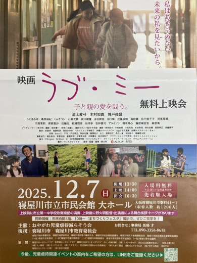 寝屋川市内で児童虐待撲滅のために活動されている 「ねやがわ児童虐待減らそう会」が主催する児童虐待を題材にした映画「ラブ・ミー」の無料上映会が開催されます。