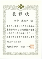 主任保育士の田中恵理子が平成27年度 大阪府社会福祉大会にて大阪府知事より、大阪府社会福祉事業従事者知事表彰を受賞しました。