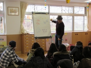 乳児の部(りす組保育室)、幼児の部(遊戯室)と分かれて「絵本の読み聞かせ」と子ども達の目の前で大きな紙に絵を描く「ライブペインティング」を行いました。