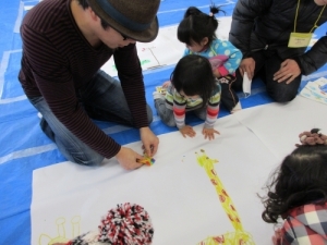 大きな模造紙に自由にお絵描きするコーナーでは、ふくだ先生の描いた絵を真似して一緒に楽しんで描く子ども達が多かったです。ふくだ先生も子ども達のお絵描きの輪に加わり、皆大喜び!