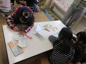 自分で考えながら色を塗り、名前や飾り付けなども描き、世界に1つだけのバッグが完成して子ども達はニコニコ笑顔でした!!「かばん持ちたい」と完成したぬりえバッグを嬉しそうに持つ姿に、こちらまで笑顔になりました