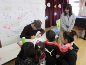持って来て頂いた絵本に子ども達の好きな動物を聞き一人一人丁寧にサインを描いて下さいました。子ども達は絵を描く様子をじっと興味津々で見ていました。