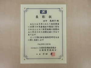 この度平成29年11月15日に当園教頭の田中恵理子が全国社会福祉協議会 ・全国保育協議会より第61回全国保育研究大会に際し表彰されました。
