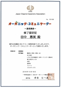 この度 一般社団法人日本オーガニック検査員協会のオーガニック・コミュニケータの認定をいただきました。