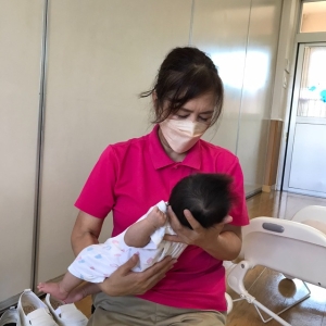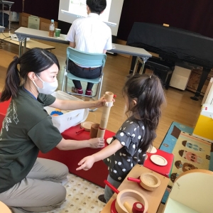 お子様はお話の間、保育教諭と一緒におもちゃで遊んで楽しく待っていました。