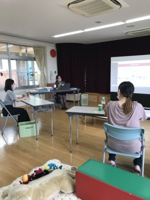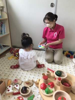 お子様はお話の間、保育教諭と一緒におもちゃで遊んで楽しく待っていました。