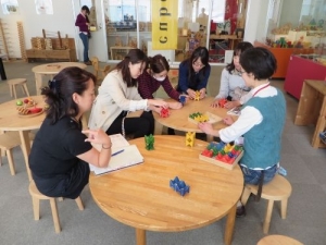 保育園で使用するおもちゃに、教育的な要素を取り入れこだわり選びたいと考え、玩具の研修を2月から行っています。今回3回目は実際に目で見て玩具に触れて考えられるようにと企画して頂きました。