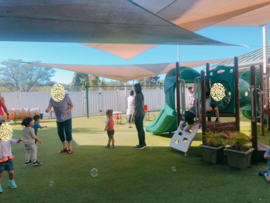 園庭は2歳児専用、3〜5歳児用に分けられており、どちらも人工芝が敷かれていたり、頭上には紫外線対策のサンシェードが張られていたりなど子ども達の安全の為の工夫がなされていました。